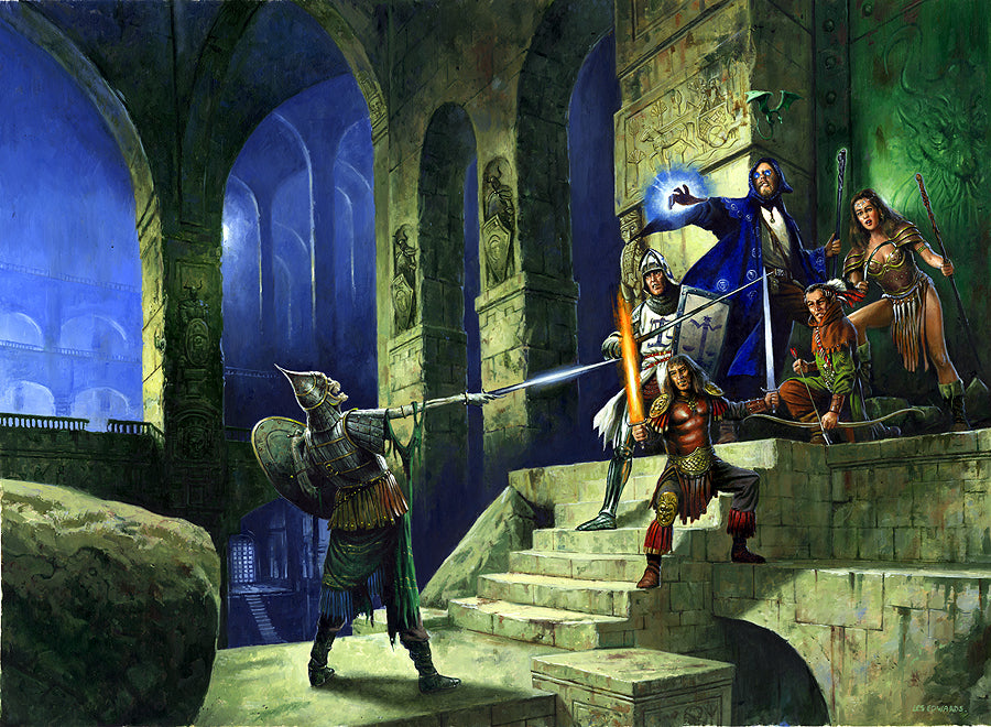 This was a private commission for a gaming enthusiast. The figures are all based on his description of his gaming friends, although the only real portrait is the wizard in the blue robe, who is, of course, the client. The initial sketch is in the Prelim Gallery.