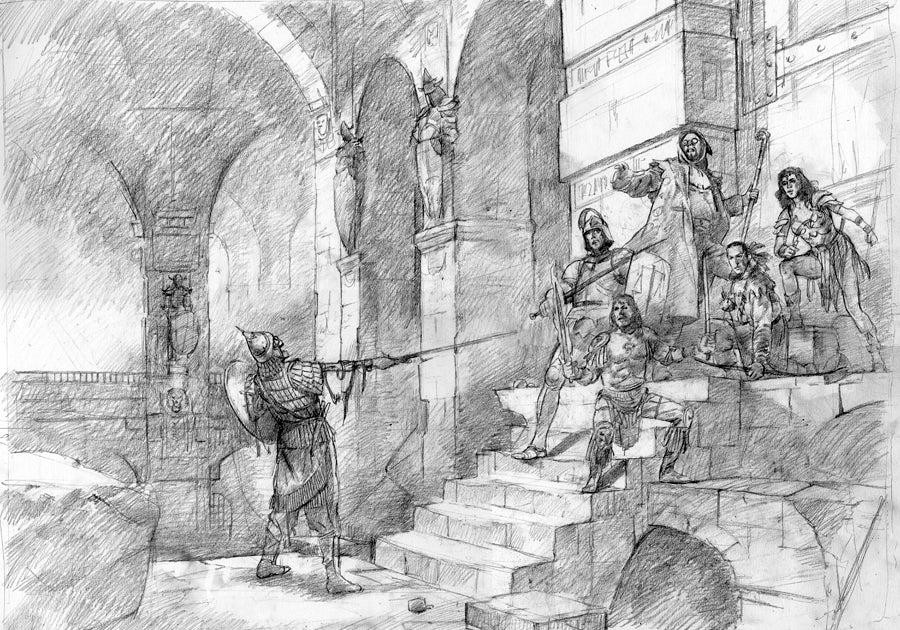 Preliminary sketch for the painting A Hard Place which can be seen in the Fantasy gallery.
