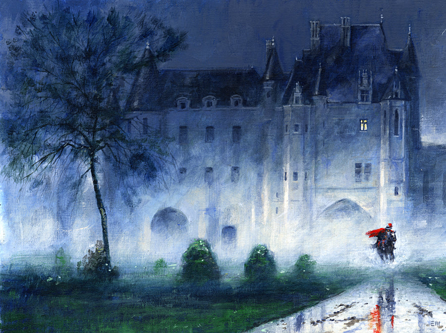 This story was a kind of fantasy version of The Three Musketeers which explains the rather French looking chateau. I like the loose handling of the building and the general atmosphere but perhaps I could have made it more obvious that it's supposed to be pouring with rain.