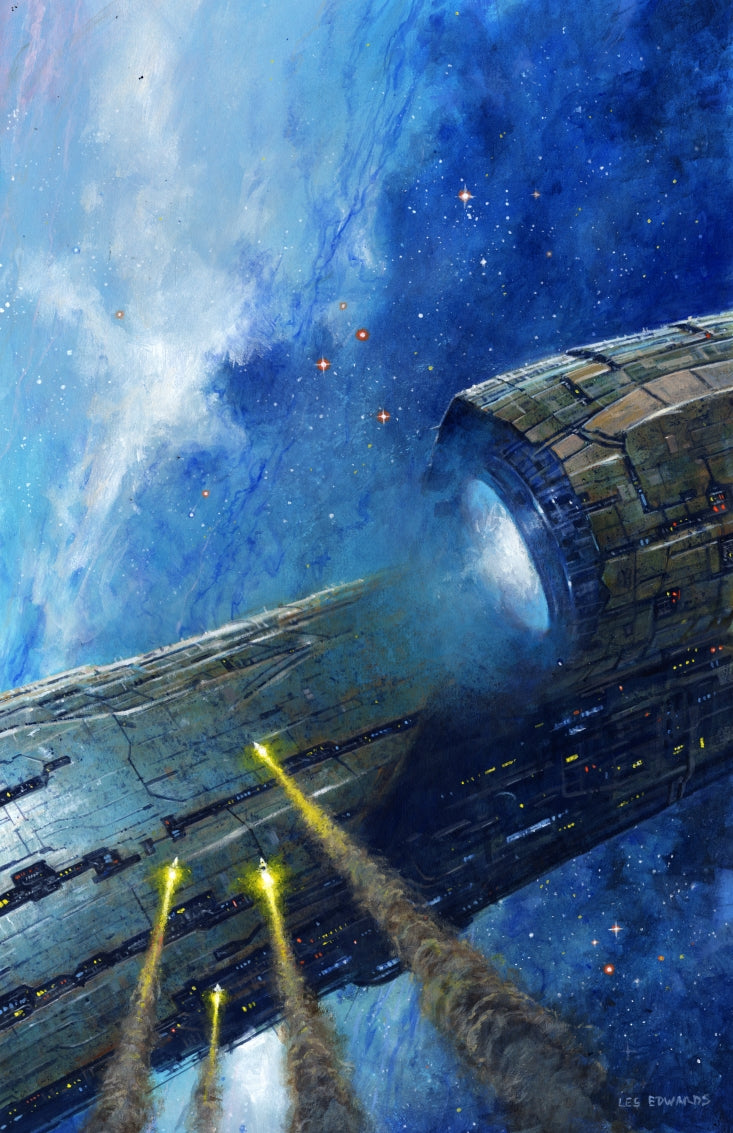 This is an image that was buzzing round my head after reading Alastair Reynolds' Revelation Space a while ago. It's not really a scene from the book but I was impressed with the descriptions of the lightship and it stuck with me. Had to be painted.