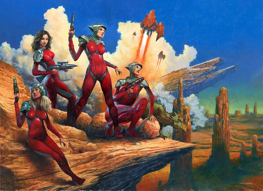 A private commission. This has quite a strong "retro" feel and harks back to the days when Science Fiction art often featured women in tight-fitting space suits. Oddly, men never seemed to attired this way. Those were the days. I think this has got a certain "Wally Wood" feel to it. No bad thing