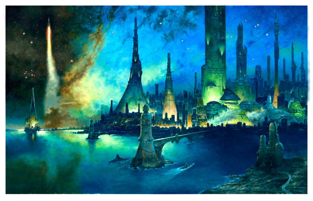 This was a private commission in which the client imagined a futuristic world at the centre of a galaxy. It does not have its own sun but is lit only by starlight.