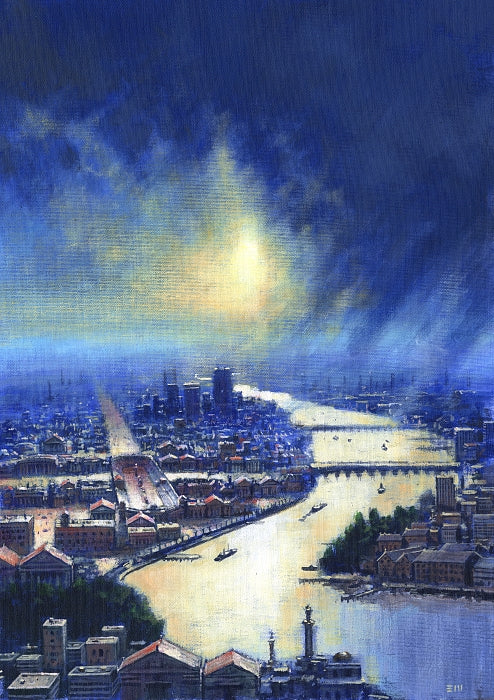 The basis of this story is that the Roman Empire never ended so the publishers wanted a view of London with a Roman look and without any of the famous London landmarks. It's probably not visible here but there is a row of crosses along the river bank where criminals are still crucified.