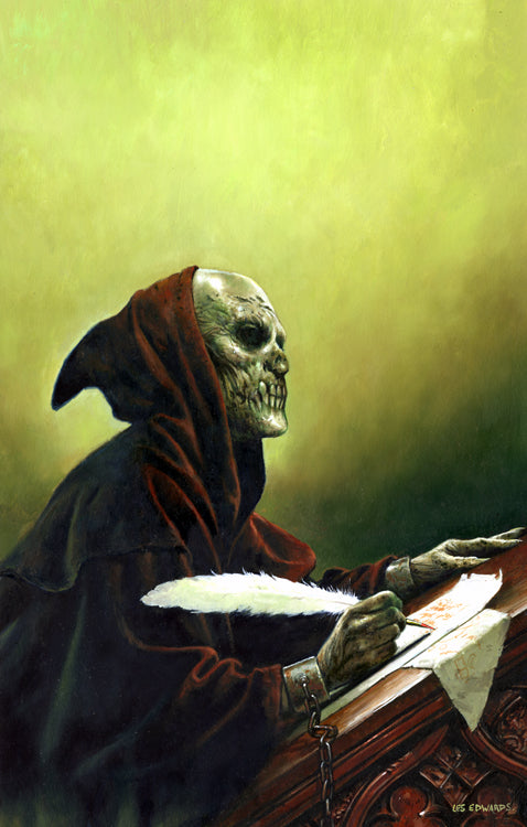 The cover for Smoke and Mirrors, a collection of screenplays, teleplays, stage plays, comic scripts and treatments by 13 masters of Horror and Fantasy. Edited by Richard Chizmar the book includes scripts by Joe Hill, William Peter Blatty and Neil Gaiman. It is published by Cemetery dance. see the Prelims Gallery for the sketch. I must be a little immodest here and say that I'm immensely pleased with this picture. For some reason it just turned out exactly right. I was very reluctant to sell it.