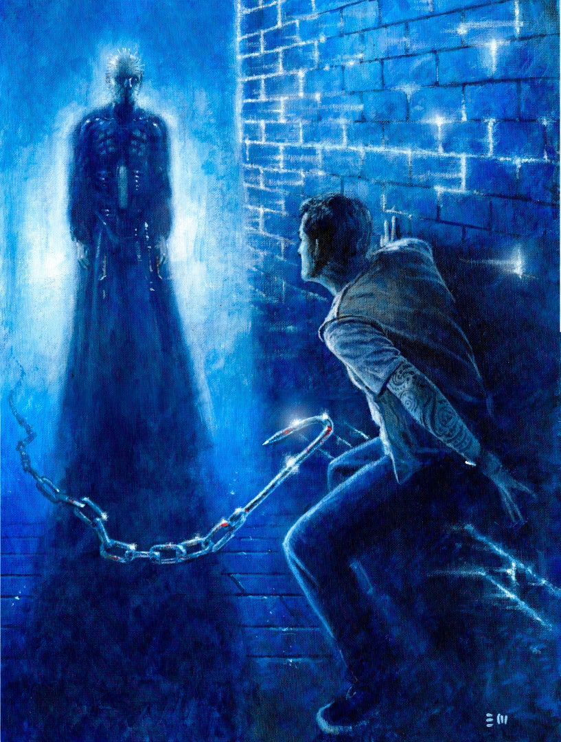 One of the illustrations for Clive Barker's The Scarlet Gospels, published by Earthling. At last, Harry D'Amour meets Pinhead.