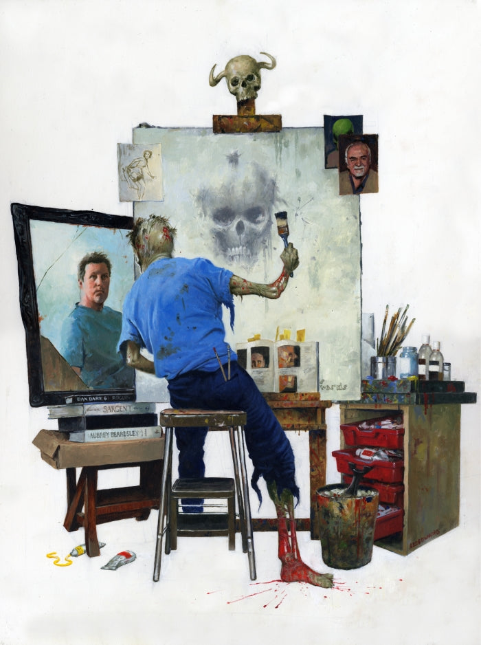 This painting was done for PS Publishing as a frontispiece to their Chamber of Chills collection for which I also wrote an introduction in my guise as an internationally renowned expert; Ho Ho! Pete Crowther came up with idea for the picture and I thought it was so good I just had to do it. If you’re a Norman Rockwell fan I hope you don’t mind. If you do, it was all Pete’s idea. Just drop him a line. He'll be glad to chat about it.