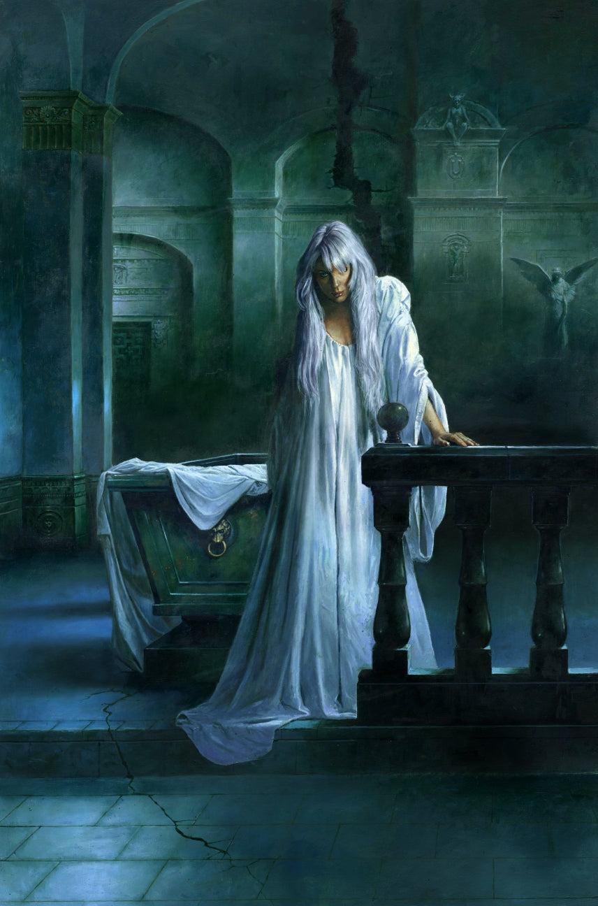 This started out in a completely different direction but magically evolved into a version of Madeline Usher. It might have been because of the woman's white hair. I was experimenting with colour again but strangely it wound up rather monochromatic. Just the feel I was after though.