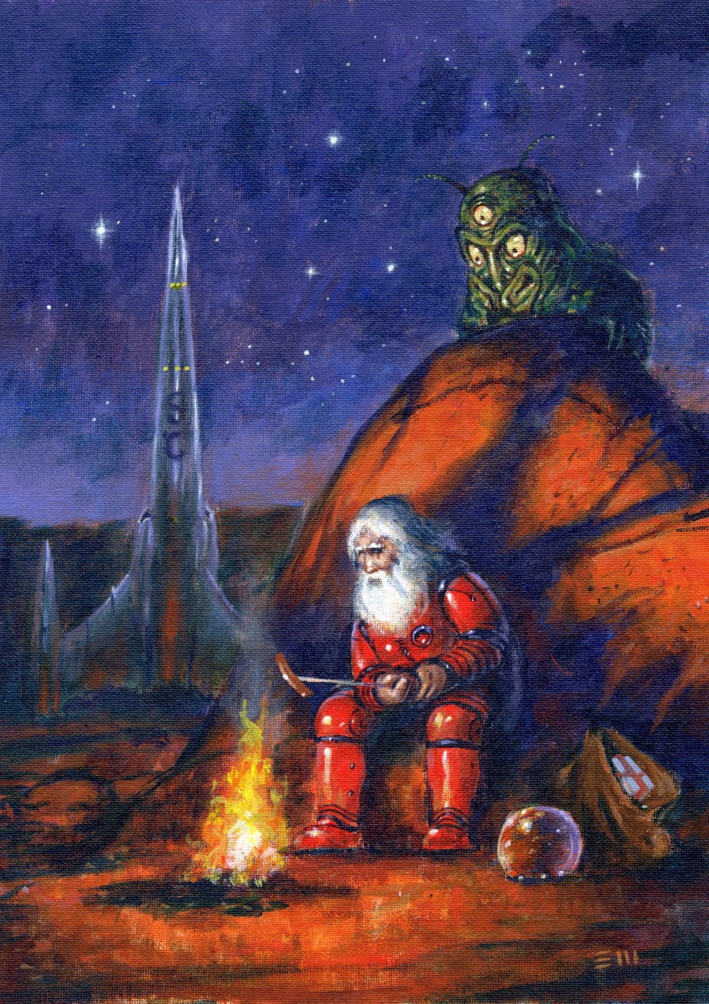 This was our Christmas card for 2019. It refers to the movie The Angry Red Planet which I saw when it came out in 1959. I would have been nine years old and it scared the life out of me. It's a terrible, terrible movie but does feature the amazing Rat-bat-spider-crab and a giant flesh eating amoeba. The Martian, most terrifying of all, only makes a brief appearance at the end. I admit it's probably too obscure a reference for a Christmas card.