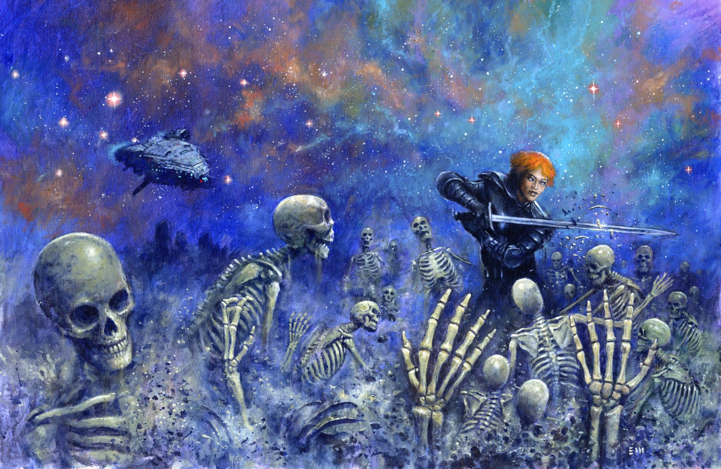 This is the cover painting for the debut novel by Tamsyn Muir, the first of a trilogy, to be published by Subterranean Press. I took considerable artistic licence with the colouring of this piece as the book describes this scene as taking place in rather bleak and drab surroundings. I thought the addition of the starry sky would give it a bit more life.
