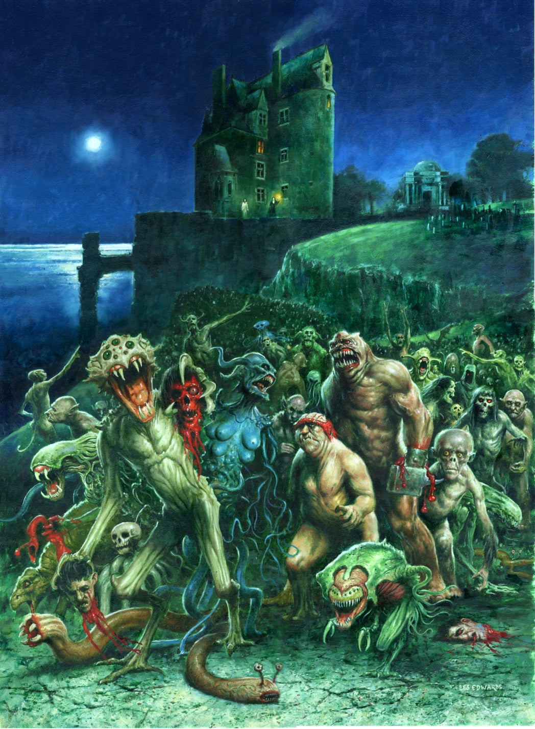 This was a private commission which was great fun to do. The client's idea was to reverse the traditional gothic romance cover where a woman is fleeing in fear from a forbidding looking building and have a horde of monsters making their escape. I found it's next to impossible to make monsters look scared but I had a good time painting them and managed to squeeze in a Sidney Jordan reference. Can you spot it?